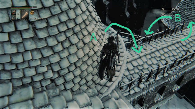 このAから下に降り、さらに奥に見える尖塔に降りたら、Bから下に